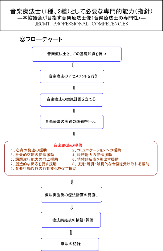 音楽療法は、幼児・児童、青少年、中・高齢者などの世代別、また、心身の障害別や健康状態によって異なってくるが、本専門的能力は、本協議会認定の音楽療法士(専修、1種、2種)として最低限、身に付けておく必要がある知識及び音楽療法を行う上での手順等を、本協議会が目指す音楽療法士像(音楽療法士の専門性)として参考までに掲げた。